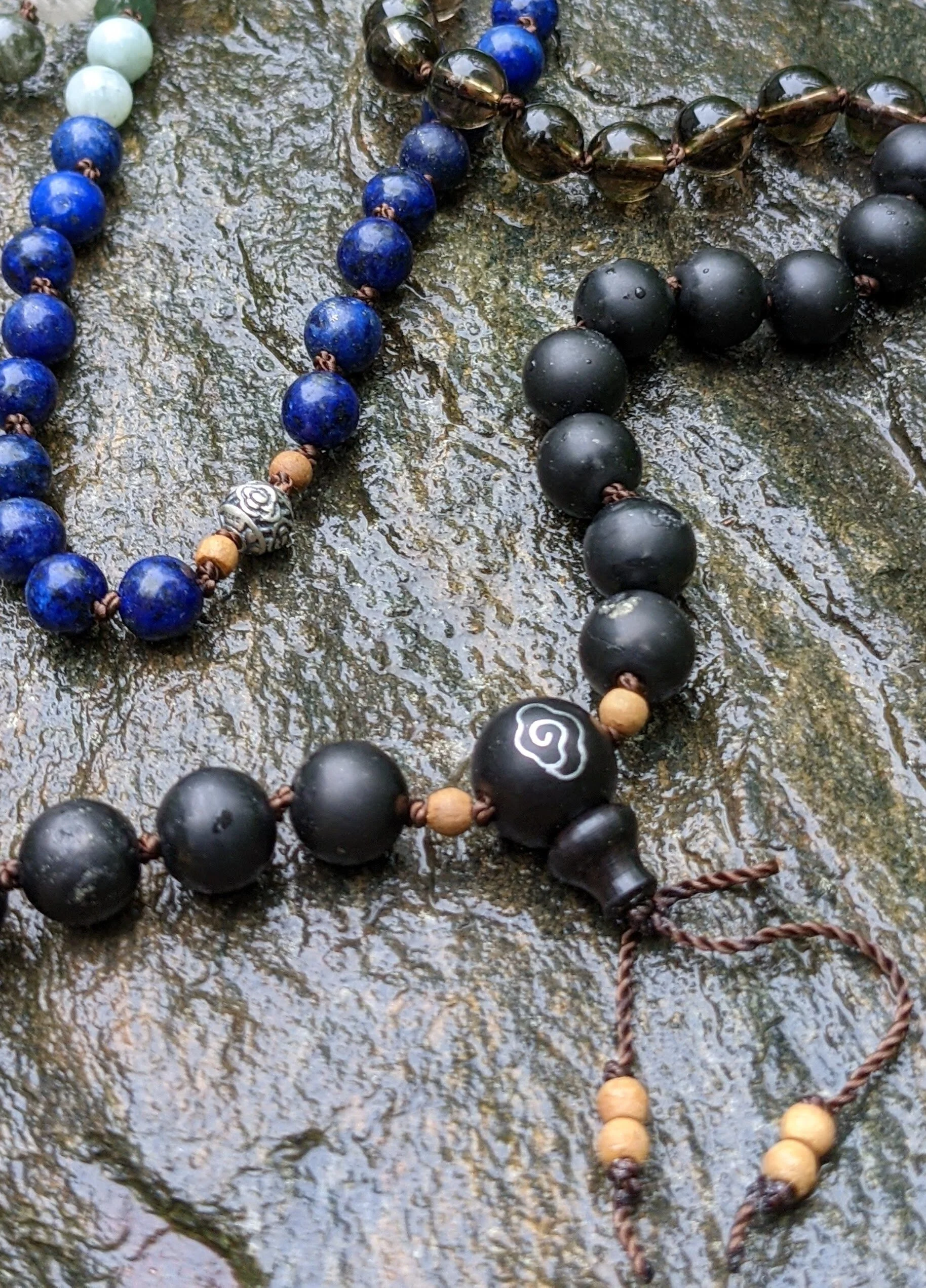 Together, the crystals in this mala form a protective shield around you both energetically and emotionally. Black Obsidian is very protective to its wearer, while at the same time putting you in touch with parts of yourself that may be difficult to accept. Jade offers comfort and soothes difficult emotions, while Lapis Lazuli brings integration of the heart and mind which works toward alignment and harmony.